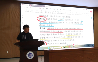 金一老师对研究生培养、评奖评优等相关制度进行解读。金老师对研究生工作部下发的一共21项相关规定进行了透彻的学习和标注,将内容主要分为4个方面进行讲述:一是关于研究生出行住宿的相关规定、二是学籍与学位培养的相关规定、三是课程学习和科研论文专业实践过程管理办法、四是奖学金相关管理体系。通过解读使新生更加清晰的明确学习目标,从而根据制度规划学习生活,合理分配时间与精力,达到事半功倍的效果。