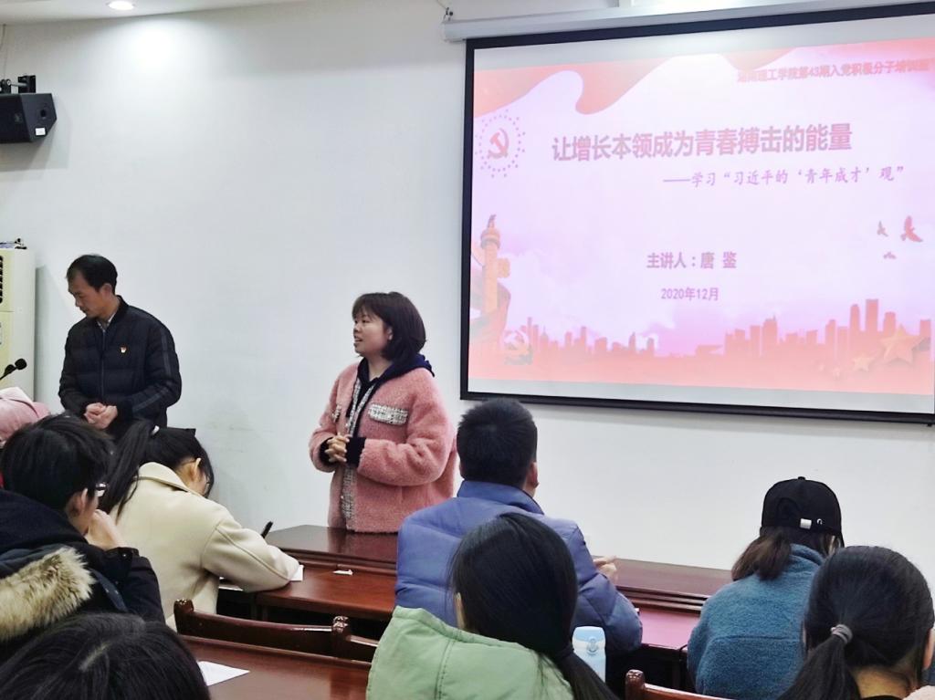 12月1日下午2:30,经管学院第43期入党积极分子培训班第四次课程《让增长本领成长为青春搏击的能量——学习“习近平的青年观”》在8301开展了。本次课程邀请到了校组织部唐鉴老师进行授课,由学生第一支部书记易振铭老师主持,第43期入党积极分子培训班全体学员共同学习。
