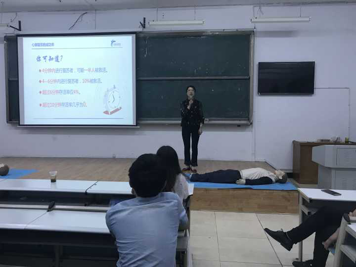 讲座伊始,湘岳医院护理部主任周瑞红为同学们讲了血吸虫病的预防。她从血吸虫的生活史、人是怎样得血吸虫病、血吸虫病的个体防护这三个部分进行了系统地讲解,并强调大家从根本上预防血吸虫病,即避免接触疫水。讲解完毕后,周瑞红主任护师就讲解的内容进行了提问,同学们积极回答,并获赠了相关书籍。随后,湘岳医院慢性伤口造口门诊护士长周燕为同学们讲解了心肺复苏术的使用方法。心肺复苏术具体分为六步:评估判断、呼救支援、调整体位、胸外按压、开放气道、人工呼吸。介绍完毕,周燕老师邀请了部分同学上台进行教学实践,同学们踊跃参与。