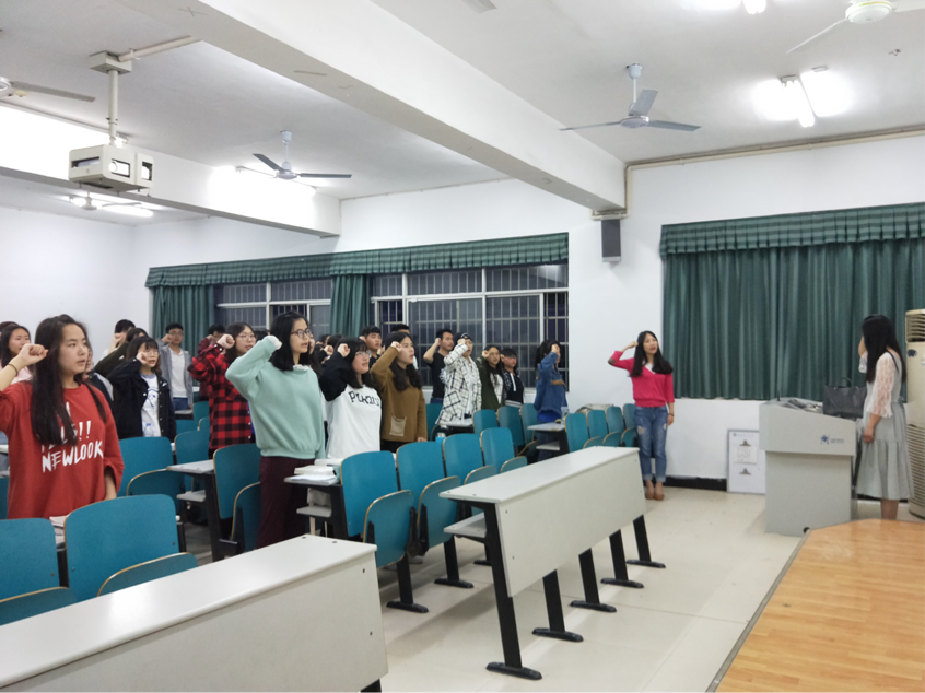 活动开始,叶老师通过讲解PPT,为同学们介绍十九大报告中“新时代、新征程”的概念。对于“新征程”的理解,叶老师从大学生活切入,鼓励同学们参加有价值的学科竞赛,树立远大理想,努力学习文化知识,提高自身素质,过有意义的大学生活。随后,围绕“高举团旗跟党走”这一主题,会场全体同学肃立,右手握拳,手举过肩,进行入团宣誓。在领誓人王娟同学的带领下,同学们高喊“为共产主义事业而奋斗!”,活动氛围热情高昂。活动最后一项,全体同学奏唱团歌,嘹亮的歌声表达了共青团员对团组织的激情与热血,同学们必将在今后的学习、工作以及生活中不断发展自己,成为全面发展的高素质人才。