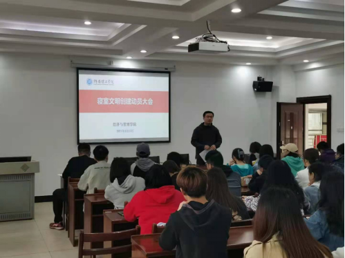 4月13日下午,经管学院2021学年度第一学期寝室文明创建工作会在8301会议室召开。参加此次会议的有学院负责指导、组织寝室文明创建工作的2020级辅导员易萧老师、2018级辅导员单芳老师,2017级辅导员顾绍春老师。还有学院团总支学生副书记、寝室文明创建工作小组组长张沁同学,寝室文明创建工作队伍的各年级学生党员、院学生分会学生干部以及学院寝室文明创建工作的各小组成员共60余名学生。