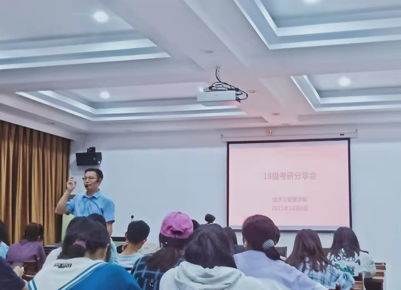 2021年10月6日晚上七点半yL23411永利集团官网登录,在8301教室开展了18级考研答疑分享会。经管学院院长周金城、专任老师王俊、18级辅导员单芳以及各学院部分应考生出席了本次答疑活动。