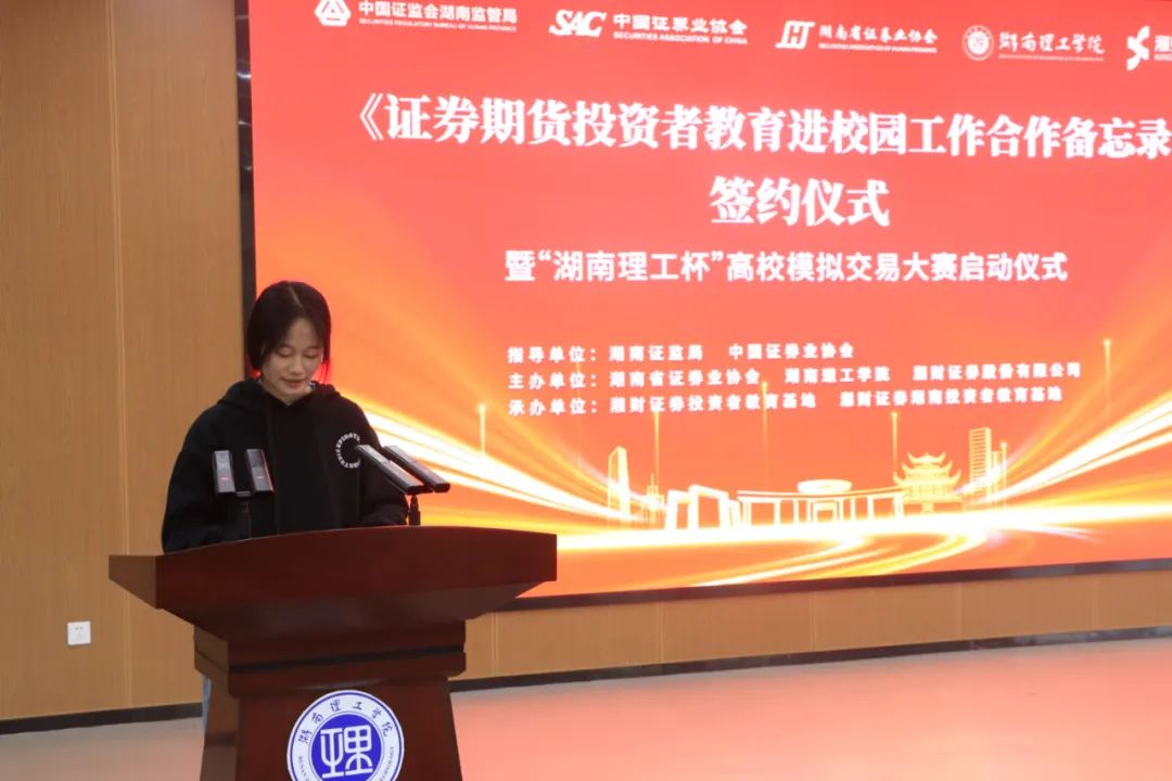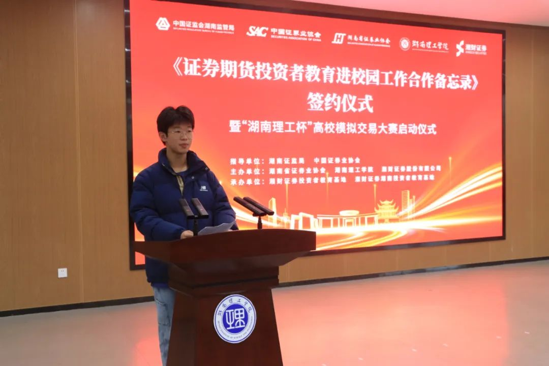 与此同时,现场还启动了“湖南理工杯”高校模拟交易大赛。本次大赛旨在通过模拟交易平台,让同学们在实践中学习和掌握证券期货投资技巧,提升自身的投资理财能力。金融工程专业学生代表卞新宇和王晓颖两位同学表示,希望通过本次模拟交易大赛,可以更好地了解和学习证券期货投资知识,同时也感谢学院与各合作单位为同学们提供了一个展示自己才华的平台。