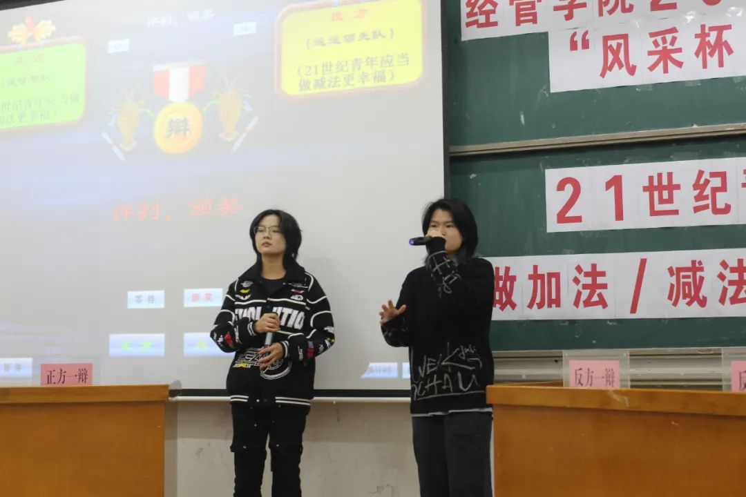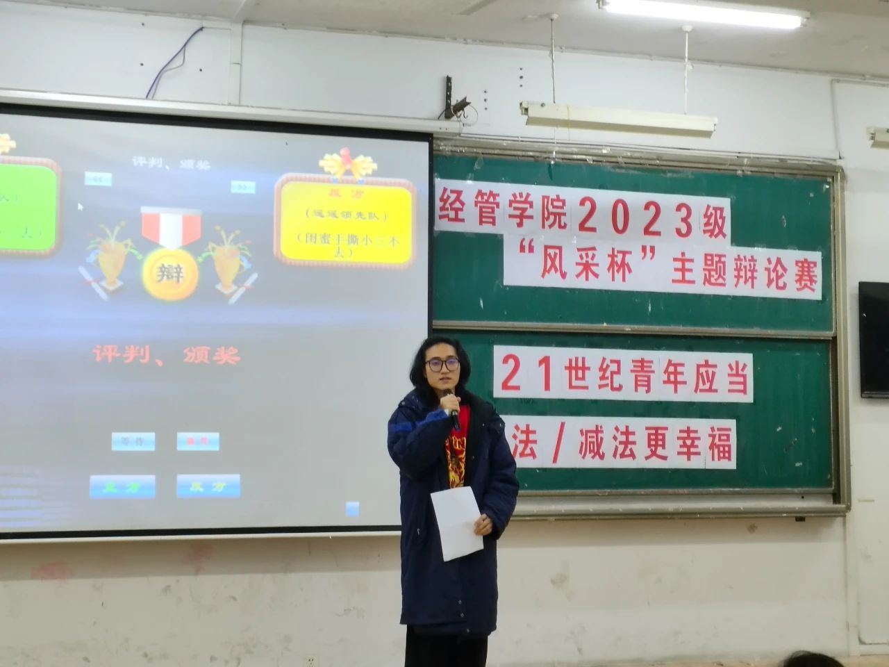 为了丰富校园文化生活,提高大学生的独立思辨能力和语言表达能力,经管学院于11月20日晚7时在8T1举办了经管学院2023级“风采杯”主题辩论赛决赛。
