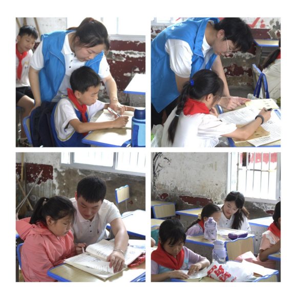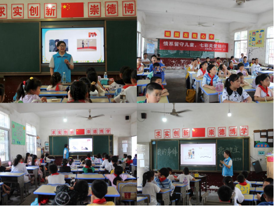 7月7日,“七彩筑梦师”留守儿童帮扶团为石潭坝中心小学学生开展了全科辅导作业、“湖湘红色”大课堂、“安全自护”课堂和“心灵关爱”课堂等活动。团队成员们了解了小朋友们的学习情况、心理状况、生活需求等,耐心倾听他们的心声和遇到的困难,鼓励他们积极面对困难。“湖湘红色”大课堂通过巧妙结合视频、素描画、剪纸画等形式为留守儿童普及红色知识,增强孩子们对湖湘红色文化的了解,厚植家国情怀;队员们以“我的身体我做主”为主题开展的“安全自护”课堂,采用知识问答等多种形式,帮助孩子们认识自己的身体,学会保护自己;“心灵关爱”课堂通过“相亲相爱一家人”“五人四纸”“你动我猜”等心理团辅活动教授孩子们心理知识,缓解和矫正留守儿童因亲子关系、校园霸凌等引起的消极情绪与不良行为。