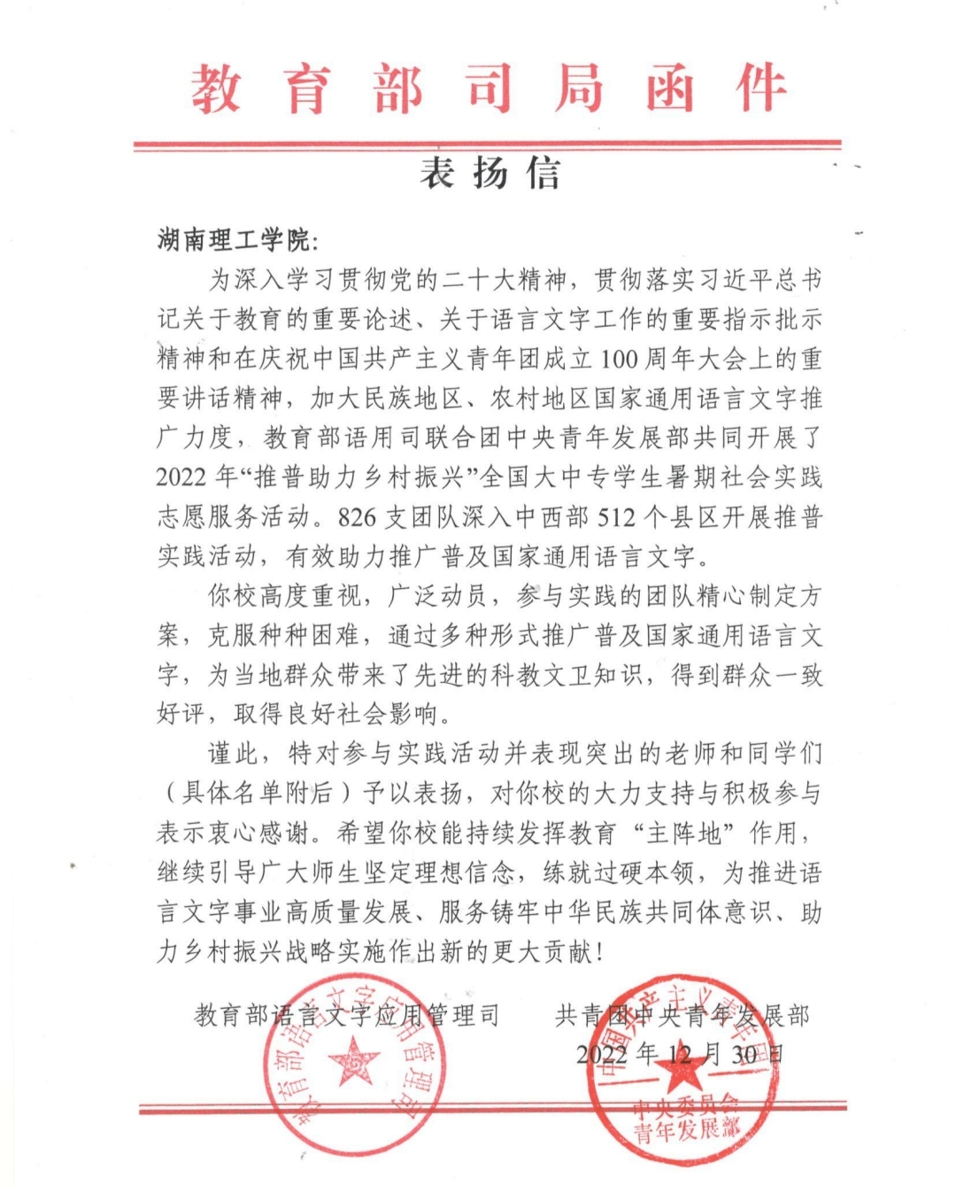 近日,由yL23411永利集团官网登录团委组织的“七彩筑梦师”团队,成功入选2022年“推普助力乡村振兴”全国大中专学生暑期社会实践志愿服务优秀团队。教育部语言文字应用管理司、共青团中央青年发展部联合向yL23411永利集团官网登录发来表扬信,对yL23411永利集团官网登录积极参与和大力支持表示感谢,对参与活动并表现突出的老师和同学们予以表扬。