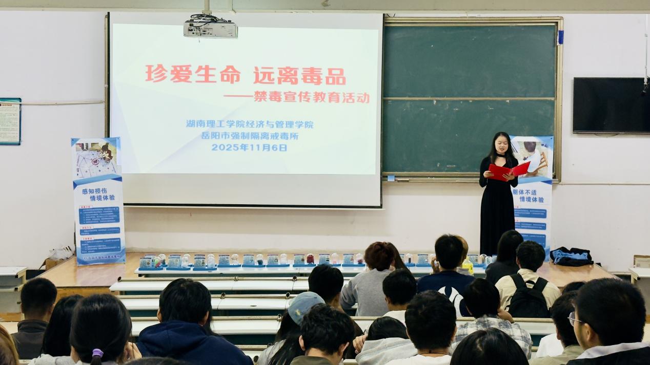 为切实增强学生禁毒意识与自我保护能力,2025年11月5日、6日晚,经管学院分别于9T1、7T1教室开展“珍爱生命,远离毒品”禁毒教育专题活动。本次活动由经管学院学生吴宇熙主持,25级辅导员张雅倩出席活动,岳阳市戒毒所肖波警官主讲,2025级全体新生参与。