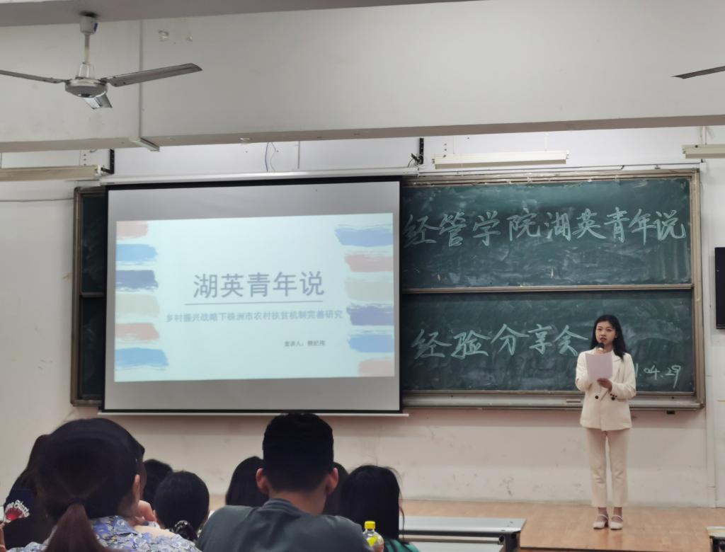 4月29日晚上19:00,经管学院“湖英青年说”公益分享会在8T1顺利举行。经管学院赖纪伟同学作为此次分享会的主讲,向20级新生们分享了自己参加“创青春”“挑战杯”项目的经验并介绍了比赛的相关流程。