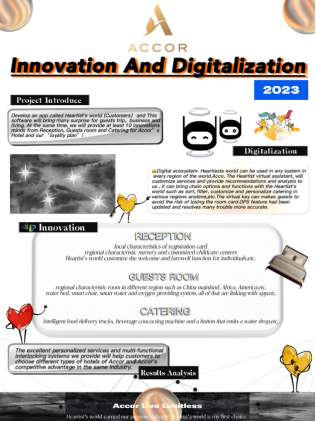 ACCOR雅高是全方位服务的国际酒店集团,通过地处全球110多个国家的4,900多家酒店和度假酒店,为客户提供各式服务。2019年雅高开始推出全新生活方式—“忠诚计划”,通过"ALL of Accor"(Accor Live Limitless)平台并结合集团的整个生态系统,为宾客日常工作、生活或娱乐增添价值。其中,雅高WORLD STUDENTS CHALLENGE为每年在全球高校中通过让在校生围绕“客户忠诚计划guests loyalty“这一使命,设计出为顾客提供完美化服务和优质创新服务的新创意竞赛。