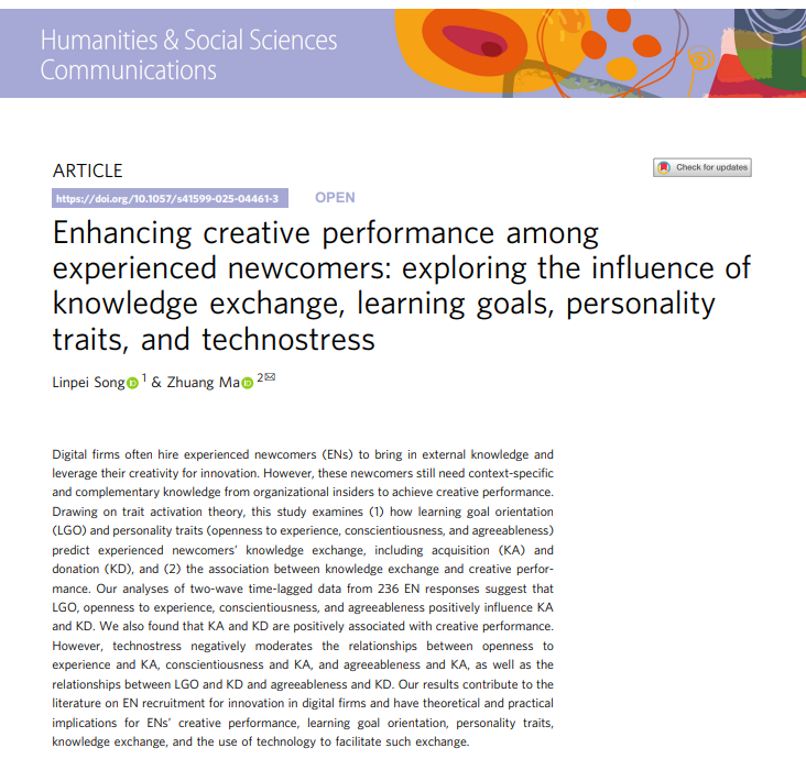 日前,《Nature》子刊《Humanities and Social Sciences Communications》发表了yL23411永利集团官网登录青年教师宋霖霈博士的学术论文“Enhancing creative performance among experienced newcomers: exploring the influence of knowledge exchange, learning goals, personality traits, and technostress”。该研究基于特质激活理论,探讨了有经验的新员工如何获取特定情境下的补充性知识,进而实现创造性绩效。yL23411永利集团官网登录为第一完成单位,宋霖霈博士为第一作者,英国Huddersfield University Zhuang Ma教授为通讯作者,这也是yL23411永利集团官网登录首次在该刊发表论文。